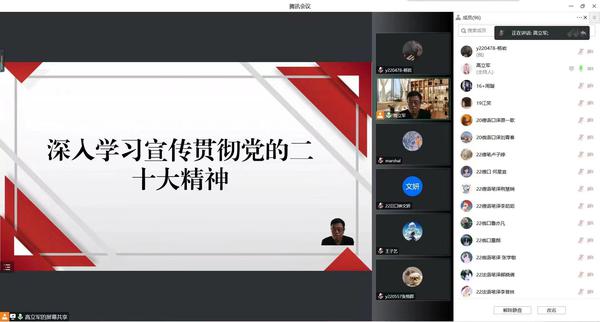 邀请马克思主义学院直属党支部副书记、副院长高立军为学院第57期党校培训班讲授题为“深入学习宣传贯彻党的二十大精神”专题讲座。会议由学院党委书记郭芃主持,2022级新生党员、预备党员、入党积极分子90余人参加线上讲座。
