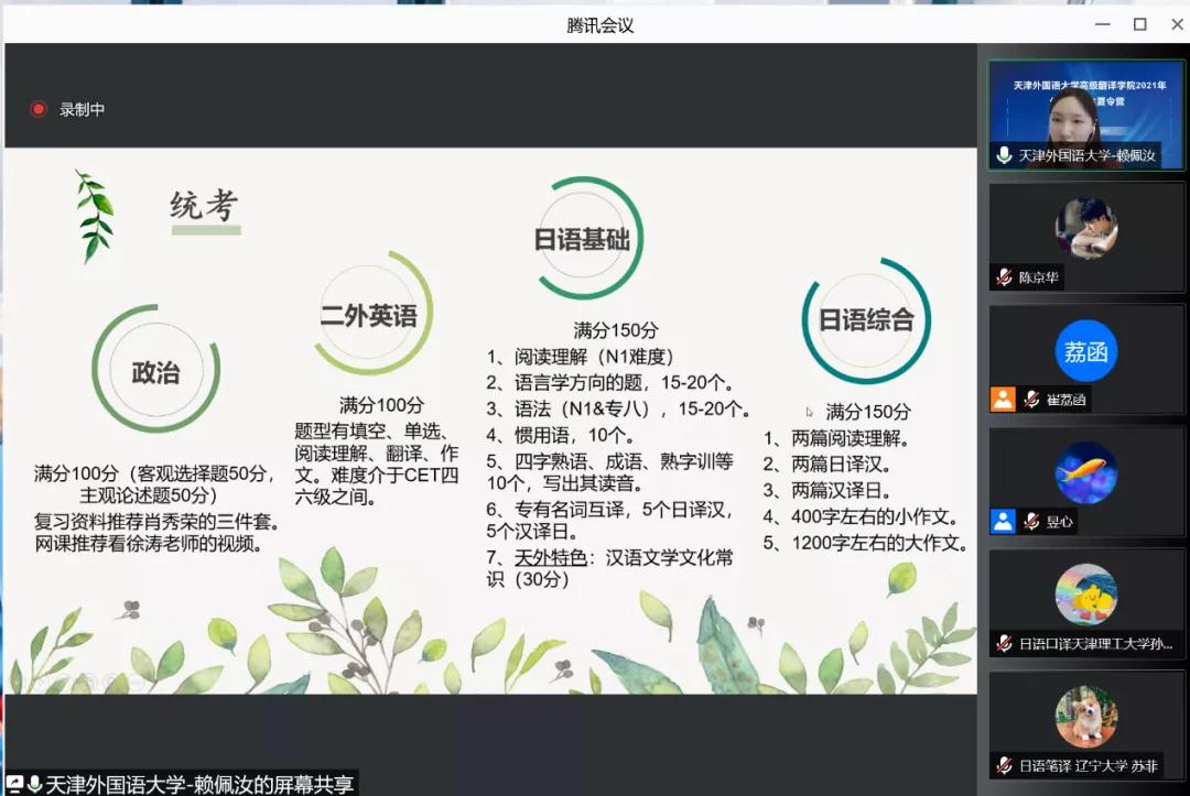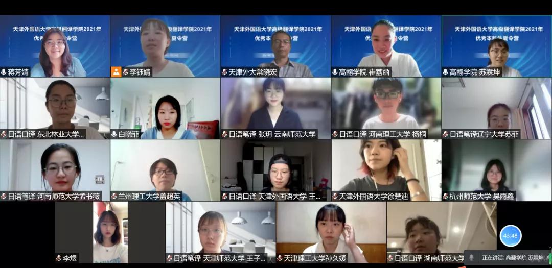 日语方向特邀香香腐宅 日语学科带头人、同传方向负责人修刚教授为师生们做了一场题为“译之魅力”的讲座,日语口译与笔译专业负责人蒋芳婧教授则从翻译学习的角度为学生们进行了讲解。在英语方向的开营仪式上,华云鹏老师从专业架构、人才培养、社会服务和国际交流等几个方面介绍了学院英语口笔译翻译硕士的基本情况,并针对学员提出的问题与学员进行了交流互动。随后,华云鹏和佟晓梅两位老师分别以口译和笔译为主题给学员带来了两场讲座。