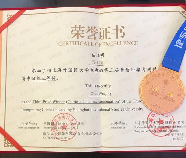 2019级日语同传方向周文颖同学经过激烈角逐,荣获三等奖,指导教师蒋芳婧教授获评“优秀指导教师”。